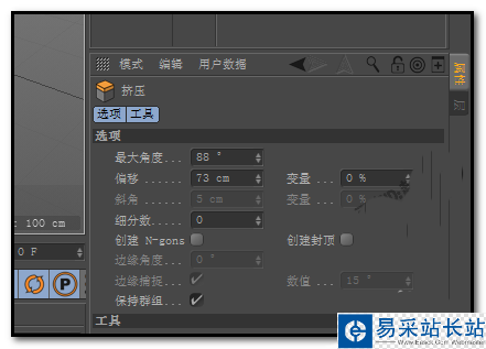 6、在界面的右下方這里,是屬性面板;當(dāng)前是擠壓的屬性;我們目光定位在“最大角度”這里;現(xiàn)在這里顯示角度是:88,那么,我們?nèi)ピO(shè)置下,把88修改為91。