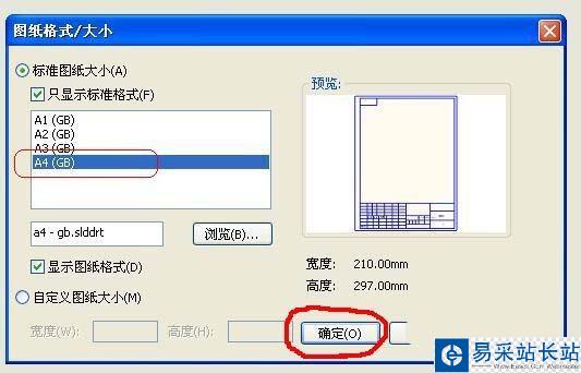 3、圖紙格式選擇(看你零件的尺寸來匹配圖紙格式的大小),此處選擇A4,點擊確定。