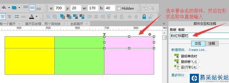 3、將下面的三個內容框矩形設為隱藏:選中要隱藏的部件,點擊勾選“hidden”;接著,把綠色部分移到黃色標題欄下面,遮住綠色隱藏部分,粉紅色類推,變成圖中的左側堆疊形態。