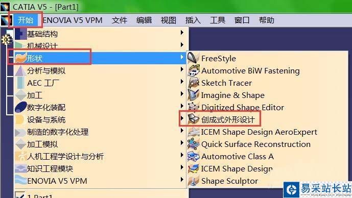 6、接著打開菜單路徑:開始>形狀>創成式外形設計,進入創成式外形設計界面。