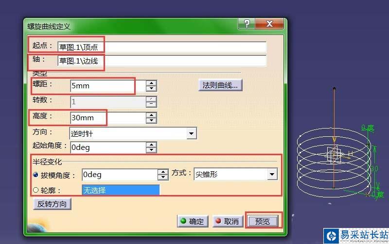 8、進行螺旋線設置,起點設置為剛才的起點,軸線設置為剛才的直線,設置螺距、高度,不要設置轉數,方向按需設置,半徑變化用來設置變半徑螺旋線。每次更改可以點預覽,設置完成,單擊“確定”。