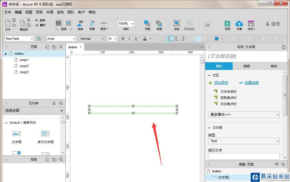 1、打開axure軟件,在窗口左側(cè)元件庫(kù)中向面板拖入一個(gè)文本框。