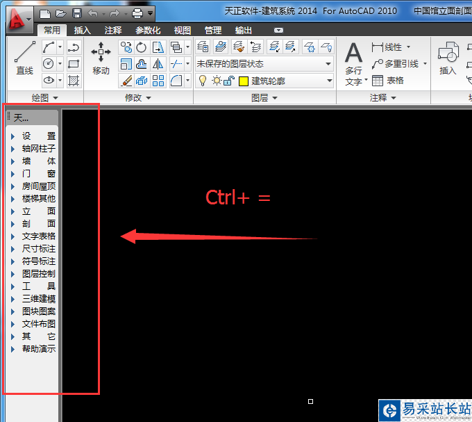 1、首先我們打開電腦上安裝的天正建筑繪圖軟件,然后左邊是否右下圖這樣框,如果沒有就按鍵盤的 Ctrl+=鍵 調(diào)出菜單欄,如下圖所示。