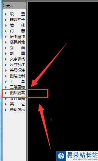 2、調(diào)出菜單來以后,然后在菜單欄里面找到“圖塊圖案”并點擊打開,如下圖所示。