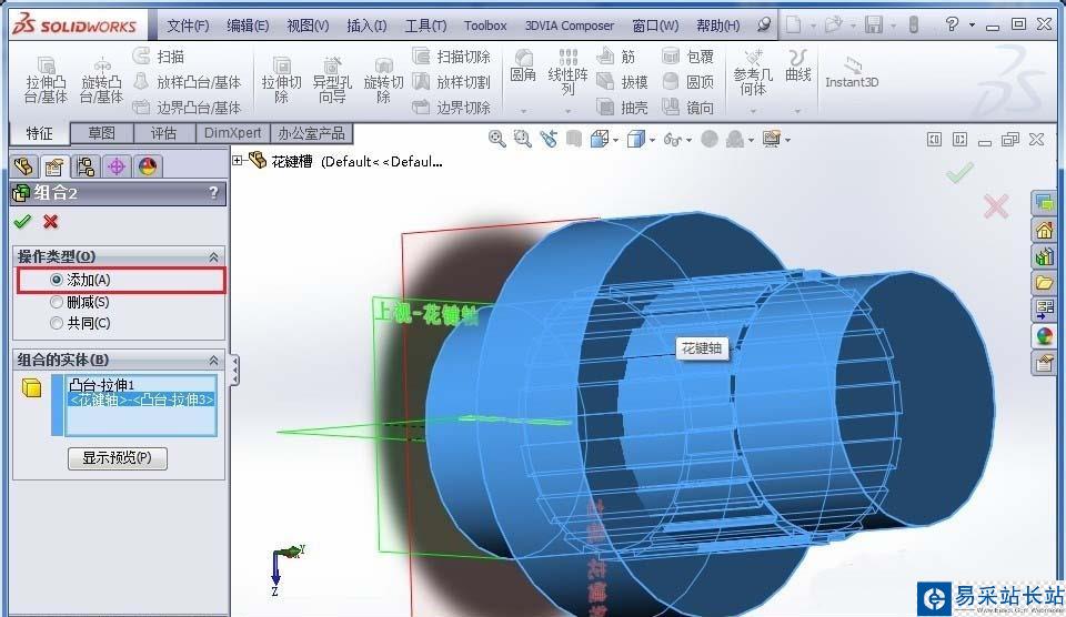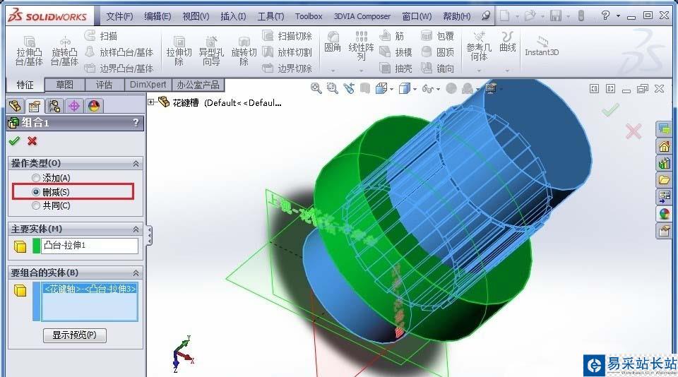 4、這里我們要借助花鍵軸來做出鍵槽,在組合選項中點選“刪減”,即將兩個零件重合的部分去除。將“主要實體”選擇為花鍵槽圓柱,將“要組合的實體”選擇為花鍵軸,這樣在執(zhí)行組合后就將保留圓柱上除公共部分外的材料,這里的效果就是在圓柱中做出了花鍵槽,如下圖所示: