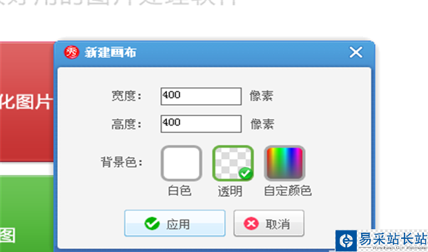 1、打開美圖秀秀,新建一塊高度和寬度都相同的畫布。背景色設置為透明。