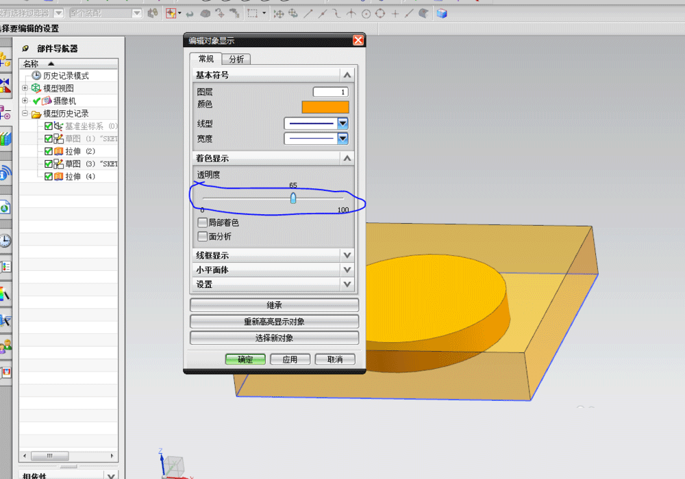 7、點擊確定,就會出現這個。只要點擊透明度就可以控制透明度了,最好將所需要透明化的實體劃為另一個圖層