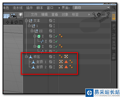 8、我們再來看另一個文本CN;我們點開擠壓前面的+號,下方展開兩個封頂;封頂1和封頂2;文字CN并沒有分開,還是連在一起。這是兩者區別三。