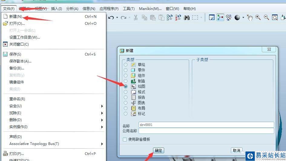 3、進入繪圖模塊。文件——新建——繪圖——確定。