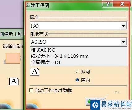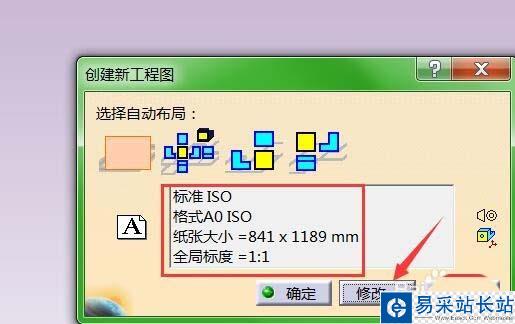 4、在“創建工程圖界面”,紅框所示為當前圖幅大小,單擊“修改”,可在彈窗中修改,即使這里不修改,后面還可以修改。