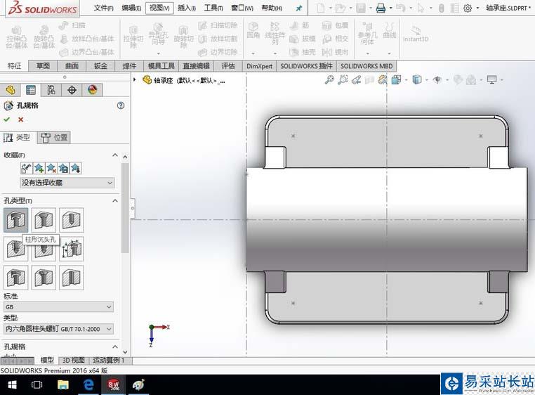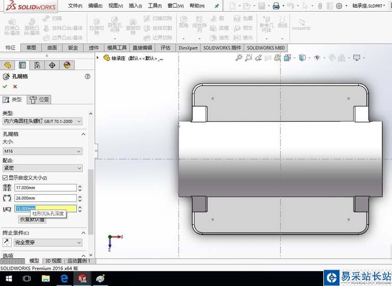 2、單擊特征,“異形孔向導”命令,孔類型選擇“柱形沉頭孔”,標準為“GB”,類型為“內六角圓柱頭螺釘 GB/T 70.1-2000 ”,大小為“M16”,配合為“緊密”,通孔直徑和柱形沉頭孔直徑保持默認,柱形沉頭孔深度設置為“15 mm",終止條件為”完全貫穿“。