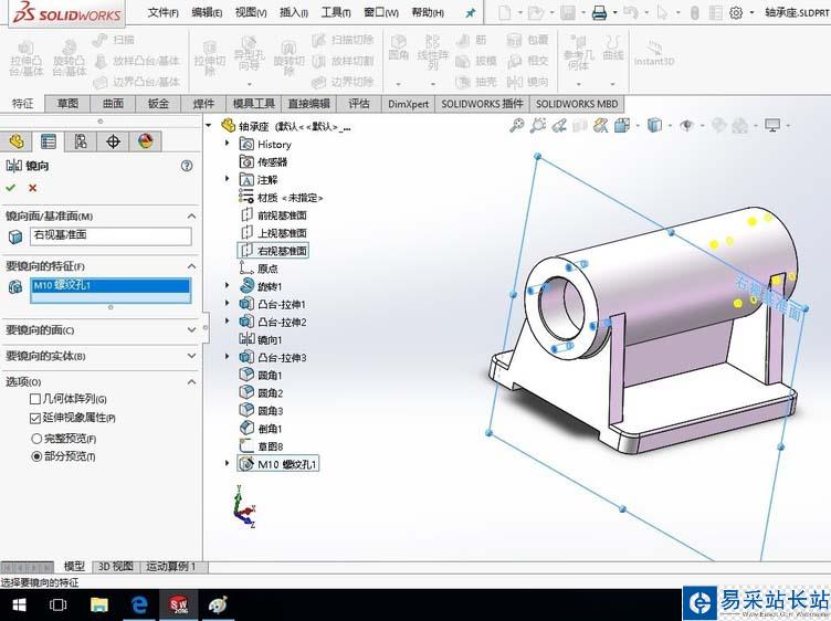 6、單擊特征,“鏡像”命令,鏡像面選擇“右視基準面”,鏡像特征選擇“M10螺紋孔1”,單擊確定,完成鏡像特征創建。至此,螺紋孔創建完成。