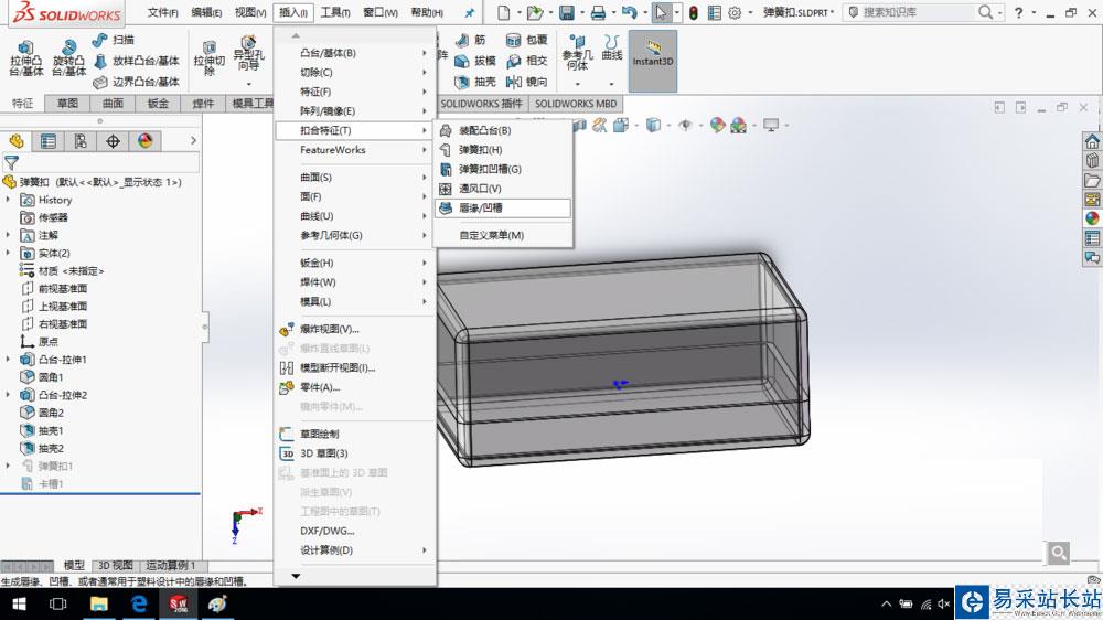 2、單擊“插入—扣合特征—唇緣凹槽”命令。