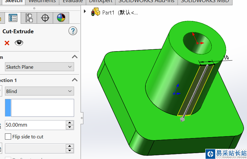 3、選擇插入-切除-拉伸命令,成形到圓柱體的底部。