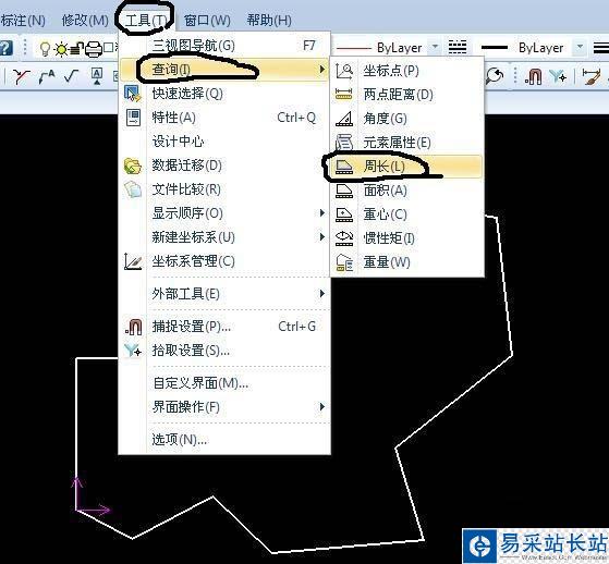 2、選擇工具--查詢--周長測量選項,點擊周長后看提示欄的提示,提示你拾取要查詢的線段。