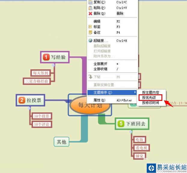 5、還可以點擊鼠標右鍵,進行按優先級的主題排序選擇,這樣可以根據這些圖表來指導每天的工作。(如下圖)