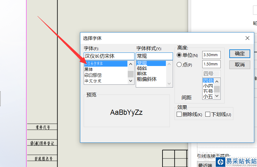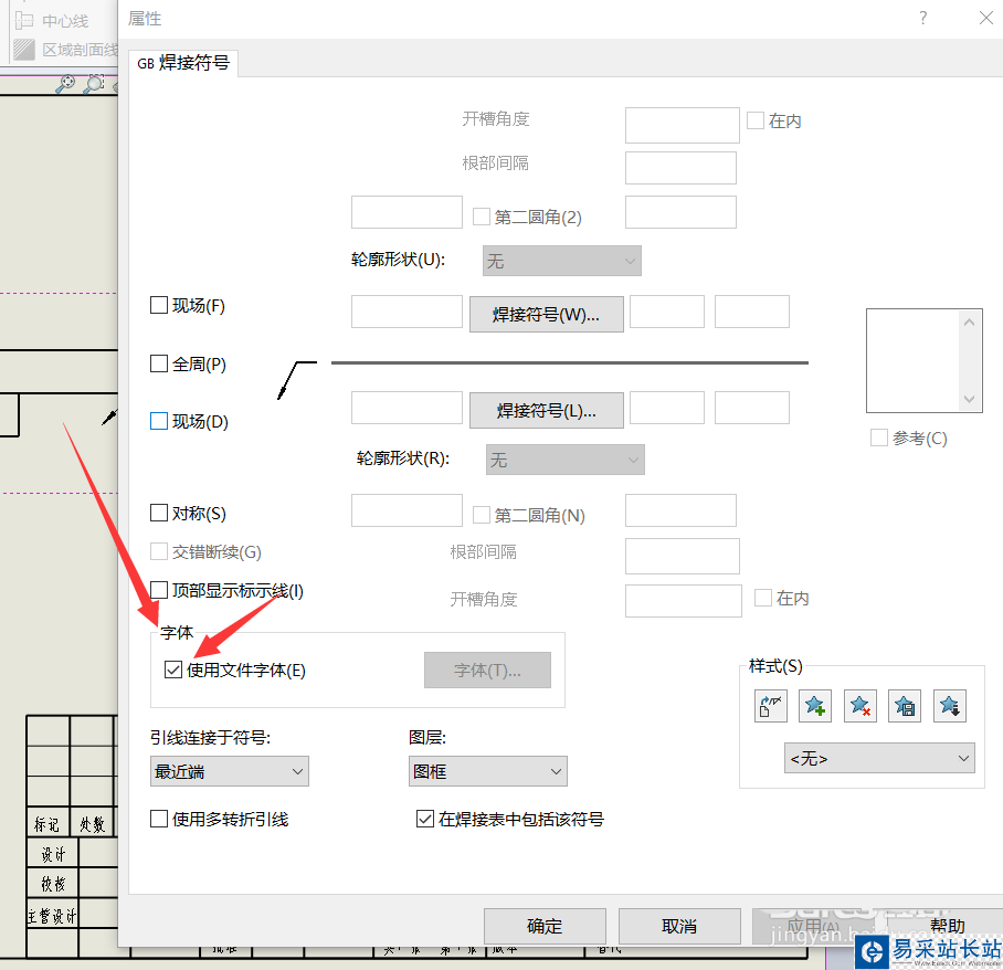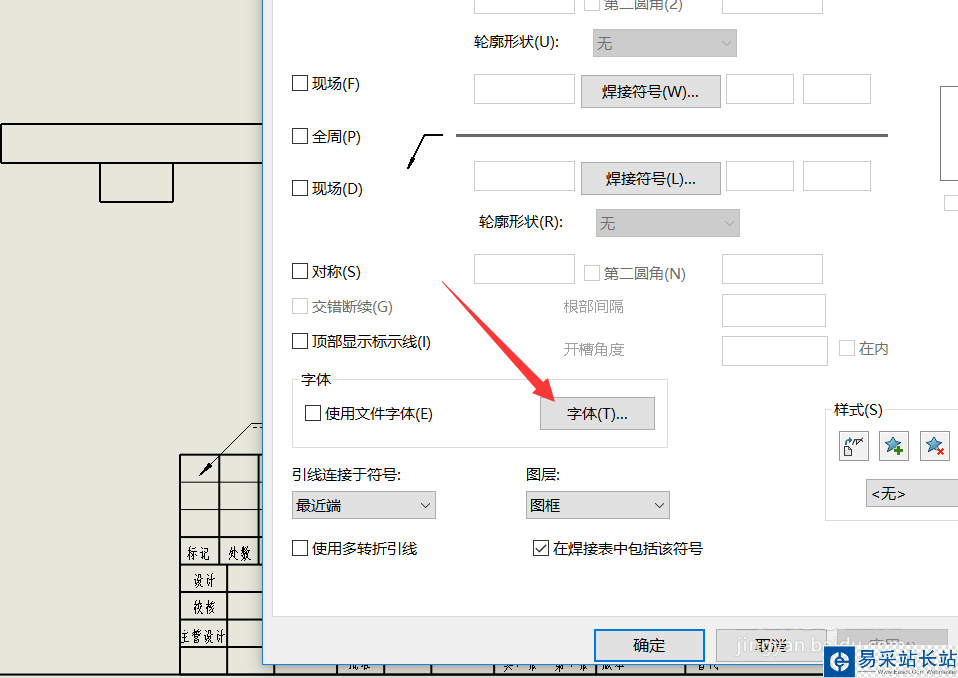 3、點(diǎn)開焊接符號(hào)之后,在彈出來(lái)的選擇框里可以找到字體,把字體前面的勾去掉。