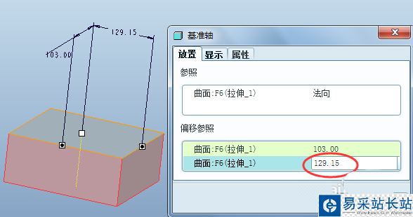 2、如下圖,要在長方體上表面中心位置創(chuàng)建一根基準軸,先選取上表面,然后點擊工具欄中的基準軸圖標,彈出基準軸窗口如下,選法向。