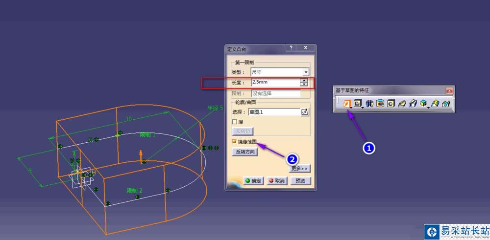 5、退出草圖界面,單擊凸臺命令,并在彈出的對話框中定義凸臺的類型、長度以及鏡像范圍等,單擊確定退出命令對話框;