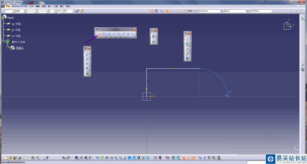 1、首先讓我們來打開CATIA軟件,進入零件設計模塊,在左上角樹形結構圖或者在視圖區選擇xy平面,單擊草圖命令進入草圖界面;