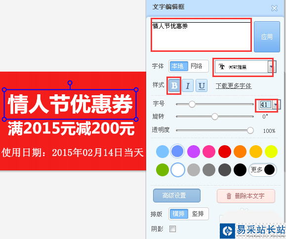 7、在文字編輯框里輸入情人節優惠券文字,設置字體微軟雅黑,加粗,字號41號。同時輸入其他相關的文字,分別輸入三次,字體大小和第一排的文字對齊即可。