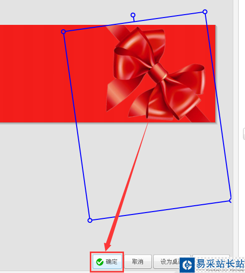 5、調整紅色蝴蝶結圖片的角度,放置于紅色背景上方的最右側顯示,調整好角度后確定即可。