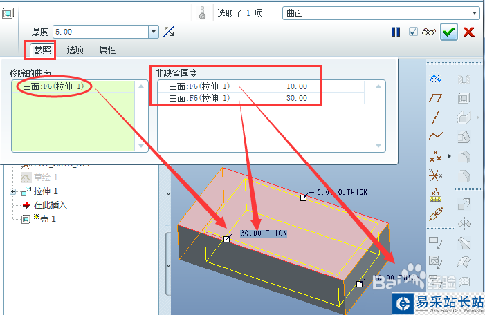 5、除了上述封閉等厚抽殼外,也可創(chuàng)建不同壁厚開口殼特征。方法為:右鍵單擊上述殼特征,或者右鍵點(diǎn)擊模型樹的“殼”,彈出列表中選擇“編輯定義”,進(jìn)入“殼”的控制面板如下。“移除的曲面”選擇上表面,“非缺省厚度”拾取左面和右面,厚度定義為30和10,按√完成。