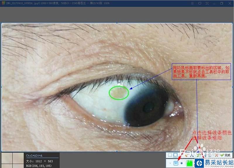 6、再按下圖依次點擊工具條中的圈狀圖形,再選擇圈的線條顏色和線條粗細。選好后就在目標點拖動鼠標圈取目標。如果沒達到預期效果,可以點擊工具條取消,重來的。直到完美。