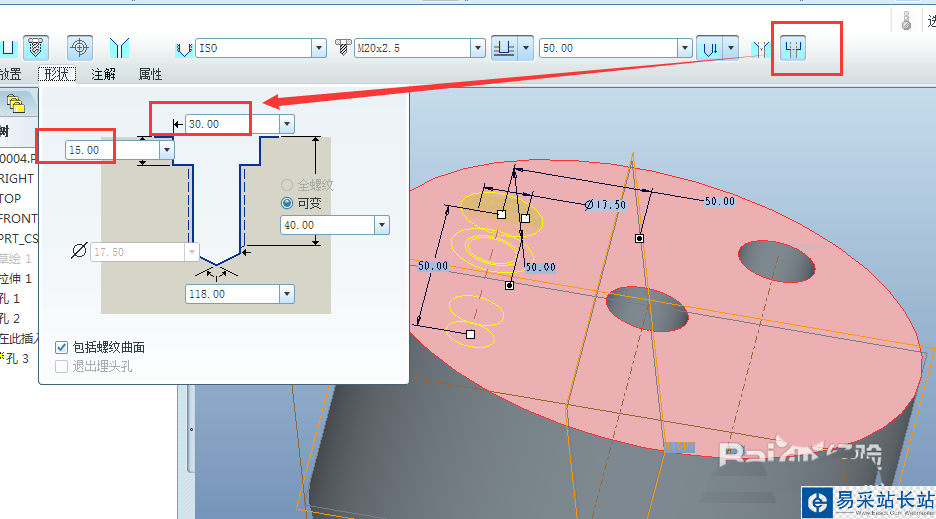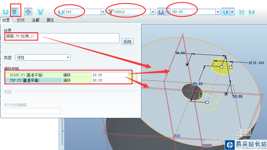 1、新建孔特征,系統(tǒng)彈出如下圖所示“孔”的操控面板,選取“創(chuàng)建標(biāo)準(zhǔn)孔”按鈕(下圖中左上角小方框內(nèi)),放置處選取上表面,偏移參照選取兩個基準(zhǔn)面且偏移距離都為50,定義好孔M30x2和孔深80。