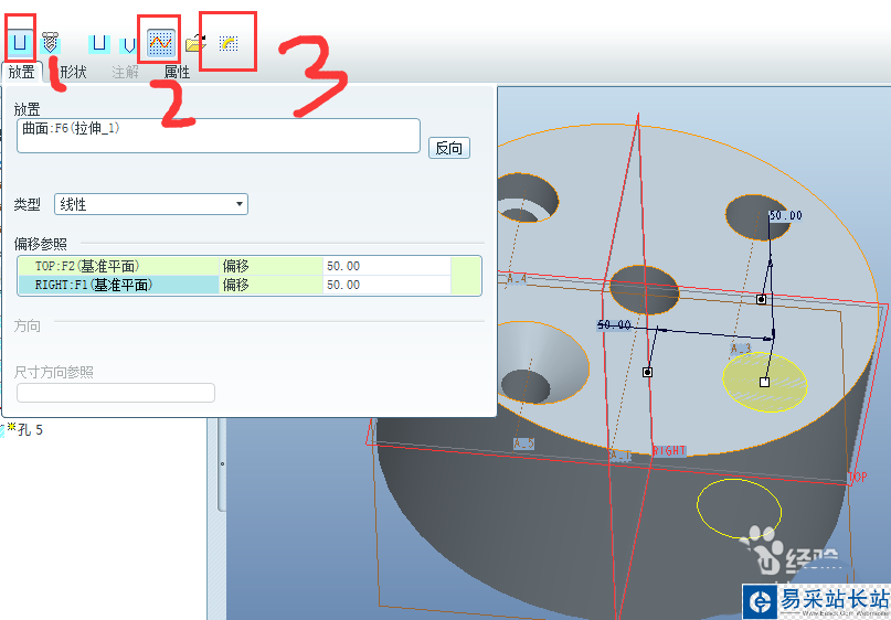1、新建孔特征,系統(tǒng)彈出如下圖所示“孔”的操控面板,選取“創(chuàng)建簡單孔”按鈕(step1),定義好孔的位置(方法與上述類似),點擊“草繪”按鈕(step2),然后點擊“創(chuàng)建截面”按鈕(step3)。