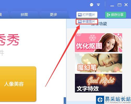 2、在已經打開的美圖秀秀,右上角處單擊鼠標【新建】,如圖所示;