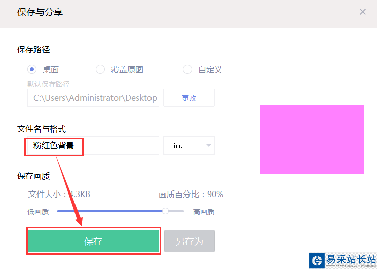 6、將已經做的畫布,在右上角處點擊【保存與分享】選擇保存到桌面,命名為:粉紅色背景【保存】。