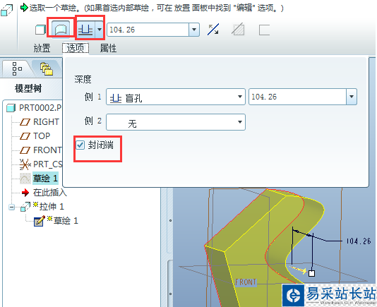 3、拉伸成封閉曲面。選擇“拉伸為曲面”按鈕,下圖第一個(gè)紅色框;拉伸方式選擇第一項(xiàng)“從草繪平面以指定的深度值拉伸”,下圖第二個(gè)紅色框;選項(xiàng)中勾選“封閉端” ,下圖第三個(gè)紅色框。深度值根據(jù)需要輸入即可。