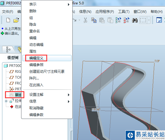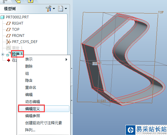 7、修改拉伸。在模型樹中的“拉伸1”單擊右鍵,彈出框中選擇“編輯定義”,即可進(jìn)入拉伸的編輯界面,對(duì)拉伸進(jìn)行修改。