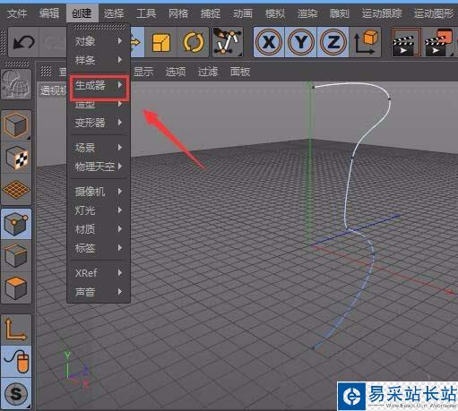 5、繪制好貝塞爾樣條線之后我們在菜單里找到創建選項,點擊該選項在其子級菜單里找到生成器選項,如圖所示:
