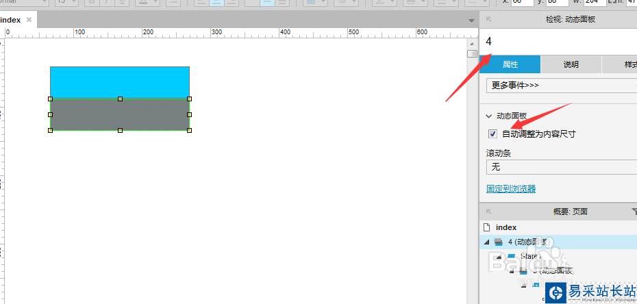6、然后,把這個新出現(xiàn)的動態(tài)面板命名為“4”。ps:如果是拖入的動態(tài)面板尺寸是固定的,需要在屬性中勾選【自動調(diào)整為內(nèi)容尺寸】的選項。