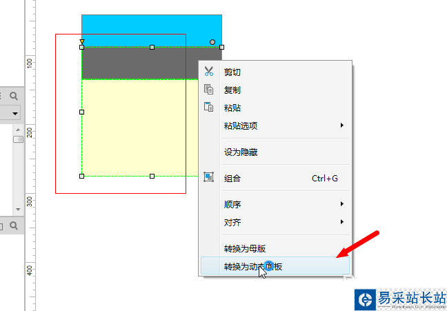 2、我們把三級菜單的三個元件全選,在上面點擊鼠標(biāo)右鍵,選擇【轉(zhuǎn)換為動態(tài)面板】的選項。