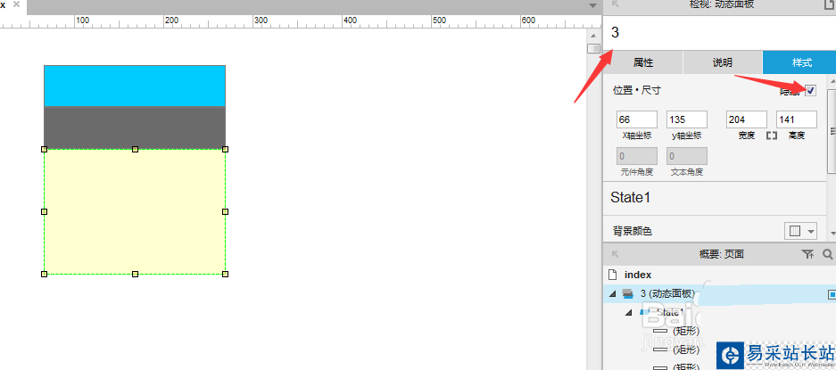 3、把這個新出現(xiàn)的動態(tài)面板命名為“3”;并且,再次點擊鼠標(biāo)右鍵或者在快捷功能區(qū)中,把這個動態(tài)面板【設(shè)為隱藏】。