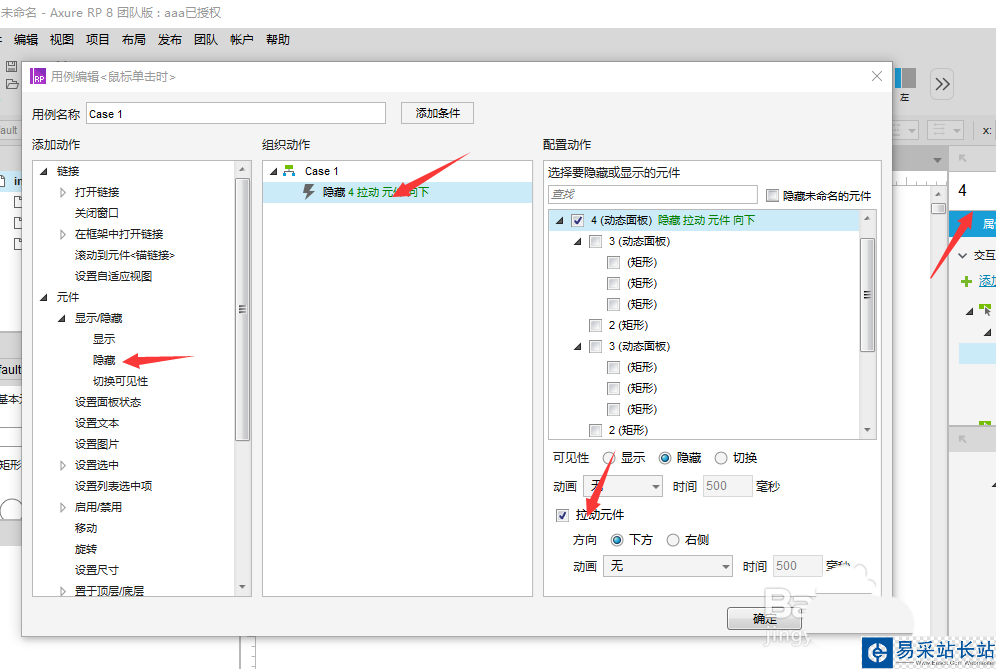 7、雙擊動態(tài)面板“4”,再雙擊第一個狀態(tài)“State1”,繼續(xù)為二級菜單元件的【鼠標(biāo)單擊時】添加動作。我們先添加【隱藏】外層動態(tài)面板“4”的動作,并且勾選【拉動元件】的選項。