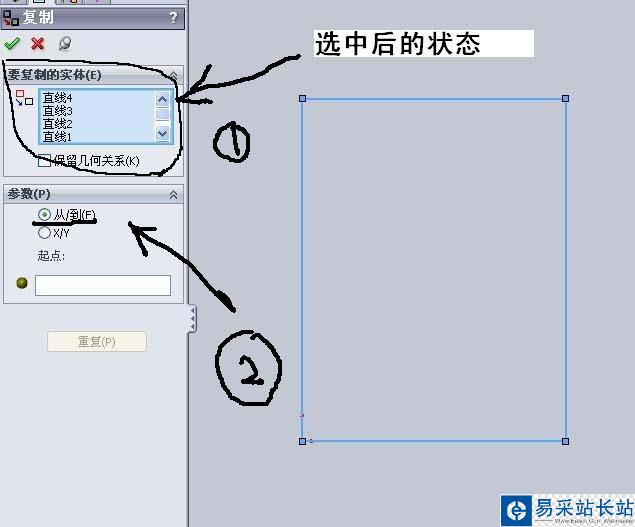 4、選擇完線段后會在左邊的提示欄里,所有選得線段都能在要復制的實體中看到。點擊鼠標右鍵確認,會自動進入下一步參數選擇。這里選擇從/到選項即可。