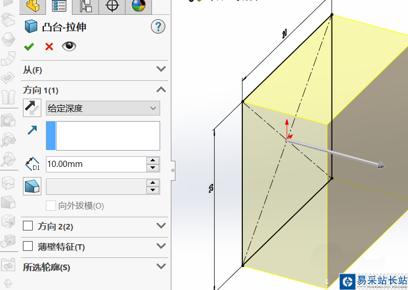 4、選擇插入選項(xiàng)中的凸臺(tái)拉伸命令,設(shè)定給定深度為10mm,選擇綠色的對(duì)號(hào)符號(hào)。