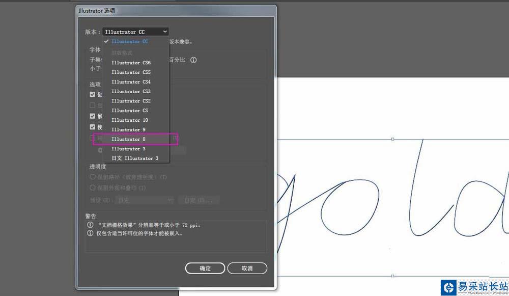2、另存時版本選擇Illustrator8,這是C4D唯一可識別的版本。