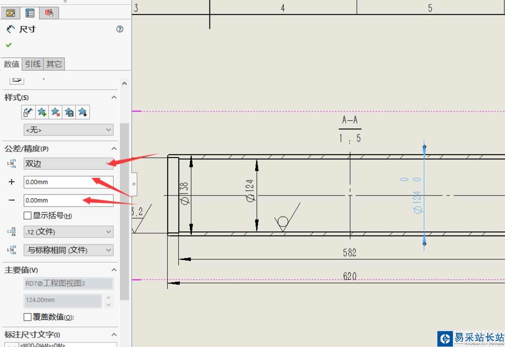 3、之后在左側(cè)尺寸欄里找到公差和進(jìn)度。