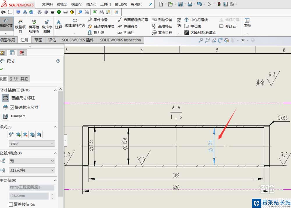 1、我們先進(jìn)入Solidworks的工程圖里面,然后選擇注解下來(lái)的智能尺寸。