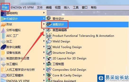 1、打開建模軟件,在菜單欄,點擊開始,如下圖,最終找到裝配設計,點擊即可啟動此模塊,進行模型設計。這里啟動此模塊,只是為了找到零件庫。