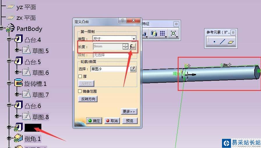 8、如果需要改長度,在樹中,找到凸臺雙擊,即可彈出設置框,可以看到同樣為灰色,清除fx即可。同理其他任何需要修改部分,都可根據具體情況,進行。
