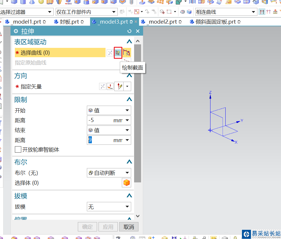 1、新建建模文件,該零件的主體可直接通過拉伸得到;選用拉伸,以XZ面為草圖平面進行截面線的繪制。