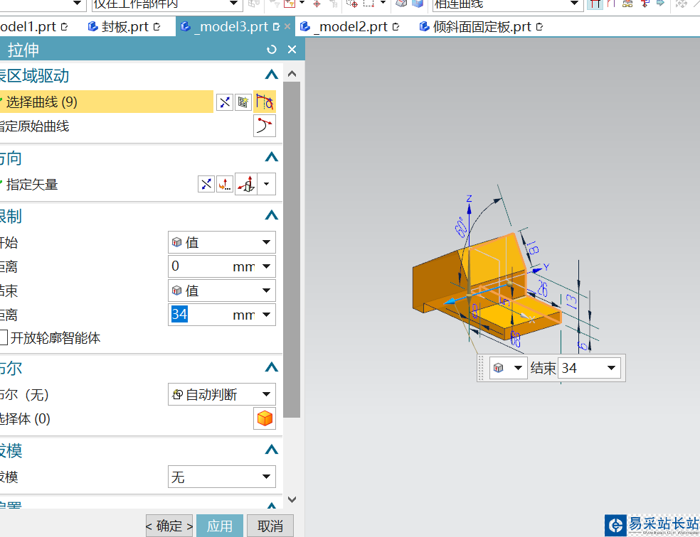 3、退出草圖模式,將拉伸的距離設定為34即得到基礎外形。
