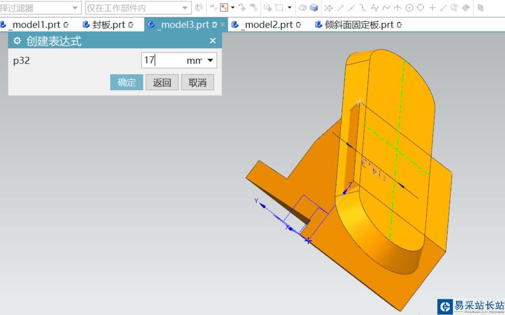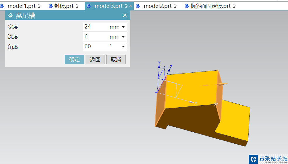 4選用鍵槽命令,選用”燕尾槽“并激活”通槽“;具體參數如圖所示,得到一個在該斜面的中間開出的燕尾槽。