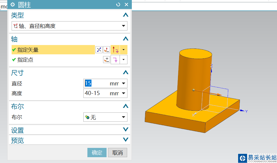 2、在立方體的上面添加凸臺,直徑30高度為50;定位于立方體的中心位置。